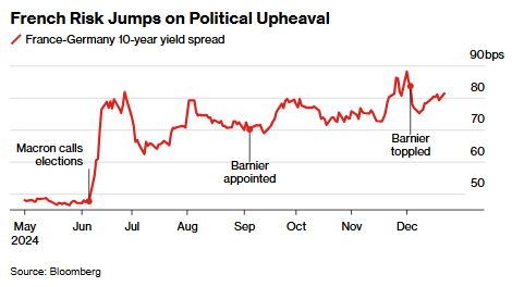 近几个月来,法国的政事和预算逆境激励了该国债务的抛售,推高了该国联系于欧洲其他国度的假贷资本。法国和德国10年期国债收益率之差周一收于81个基点,为12月4日以来的最高水平。
