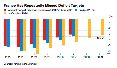 欧盟礼貌成员国的债务不得率先GDP的60%,赤字不得率先3%,但法国永久以来一直莫得谨守这一礼貌。因此,来岁的预算需要削减法国现在已激增至经济产出的6.1%的赤字。