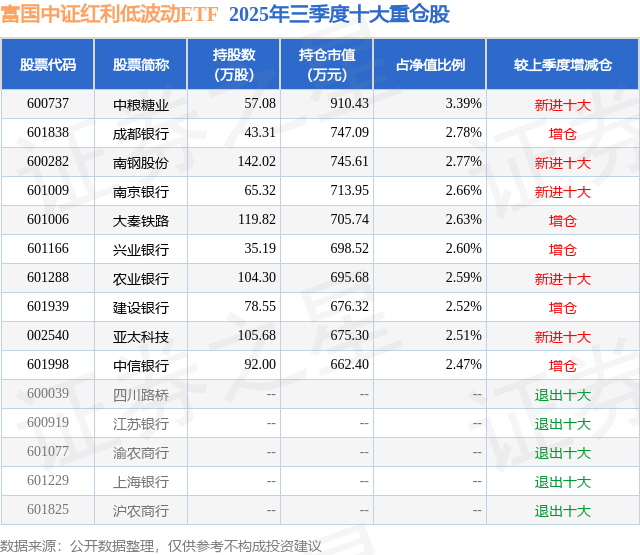 从基金限制来看,富国中证红利低波动ETF基金2025年三季度公布的基金限制为2.69亿元,较上一期限制2.51亿元变化了1815.98万元,环比变化了7.25%。该基金最新一期钞票建树为:股票占净值比99.61%,无债券类钞票,现款占净值比0.54%。从基金执仓来看,该基金当季前十大股票仓位达26.92%,第一大重仓股为中粮糖业(600737),执仓占比为3.39%。
